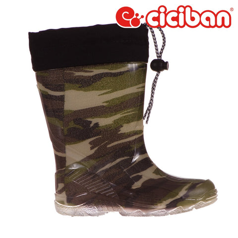 Fun boy's‚ rain‚ boot with a modern camouflage‚ print all over. This boot has a leather insole with arch support and a drawstring top to keep splashes out.‚ The leather‚ insole is removable to allow for easy drying.
