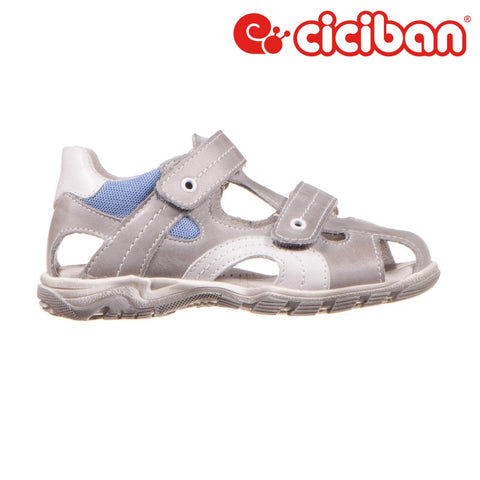 Smooth leather grey‚ upper, with light‚ blue and white accents. Double velcro straps for easy adjustment.