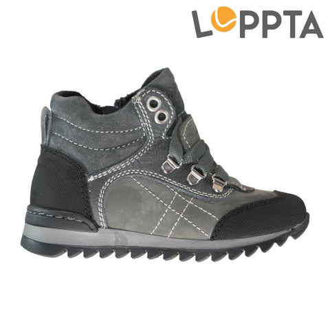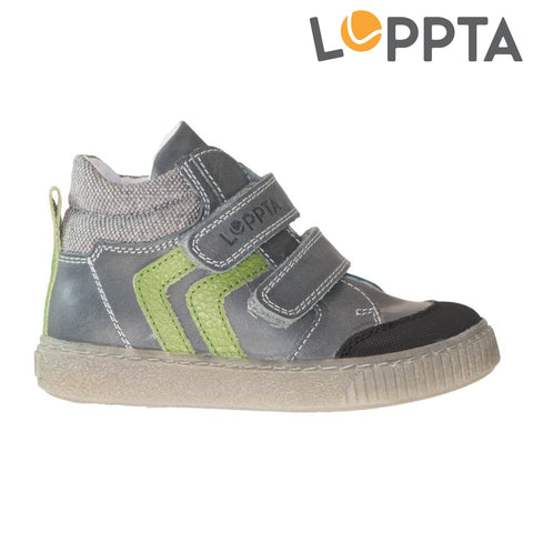 Boy's high-cut‚ grey leather shoe. Smooth leather grey side panels‚ with green lines accents.