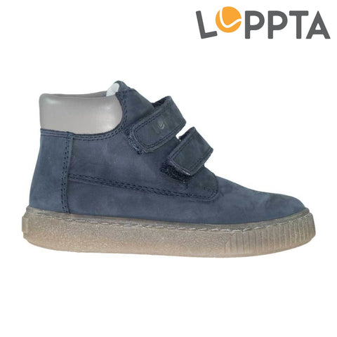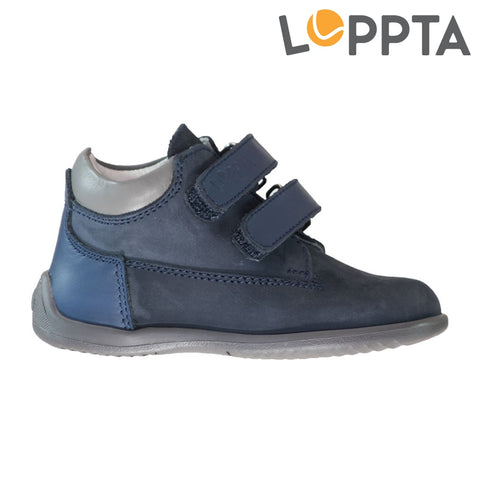Midnight blue nubuck leather boy's shoe with leather lining, leather insole, and high arch support.