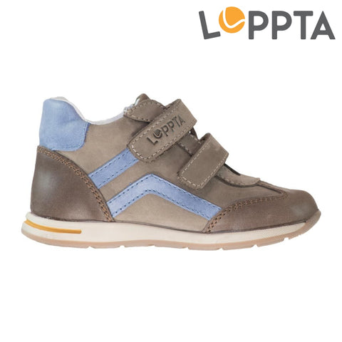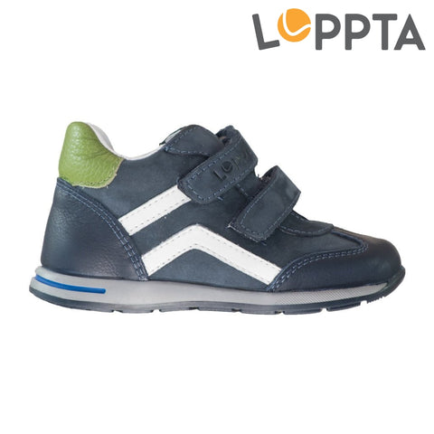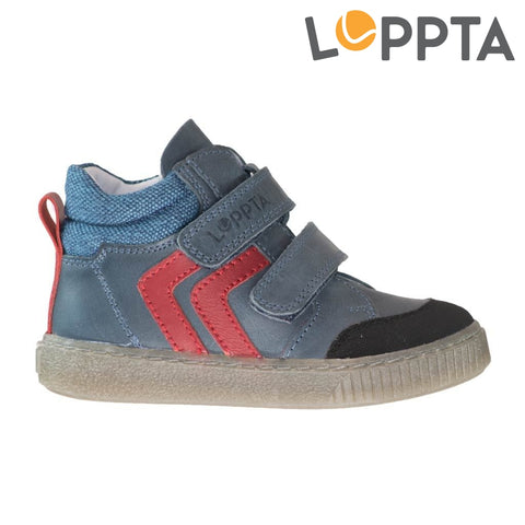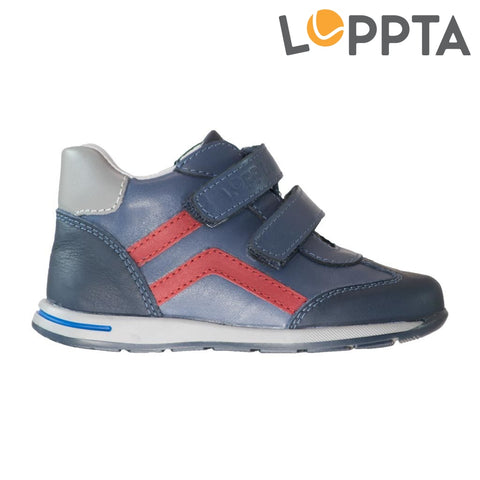 Boy's high-cut‚ blue leather shoe. Smooth leather blue side panels‚ with red lines accents.