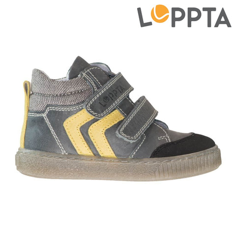 Boy's high-cut‚ grey leather shoe. Smooth leather grey side panels‚ with yellow lines accents.