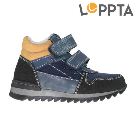 Boy's high-cut‚ blue leather shoe. Smooth and nubuck leather blue side panels‚ with yellow and black accents.