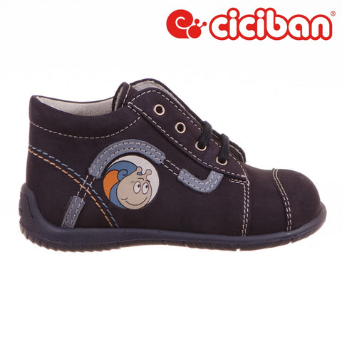 Boy's lace-up shoe, handmade in Europe. Navy blue colour with cute snail picture on the side. Nubuk leather upper, leather insole, and leather lining. Supportive, flexible‚ anatomic‚ construction with arch support.