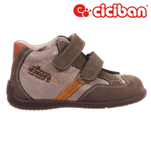 Nubuck leather boy's shoe with leather lining, leather insole, and high arch support. Ultra thin, flexible sole to gently support first steps. Taupe and stone colours with orange accents.