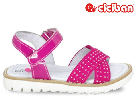 Girl's pink patent leather straps, with adjustable velcro straps at the ankle and toes. Smooth leather lining with arch support.