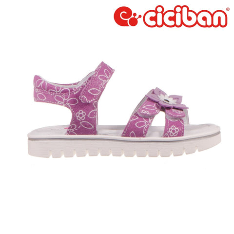 Beige‚ suede with pretty‚ leather flower decoration on the toes. Closed supportive heel. Adjustable velcro straps at the ankle and toes.
