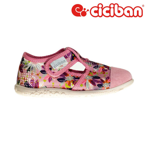 Girl's‚ open slipper or light shoe, handmade in Europe. Pink‚ with colourful flower print.