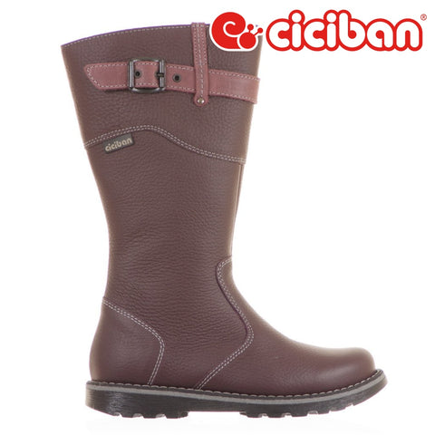 Full grain leather girl's riding boot, handmade in Europe. Rich prune colour. Smooth leather with warm fleece lining, and leather insole.