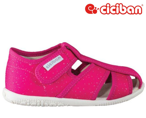 Fun hot pink canvas slipper with glittery dot accents!‚ Girl's slipper or light shoe. Leather insole with arch support.
