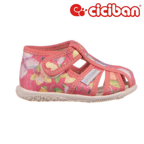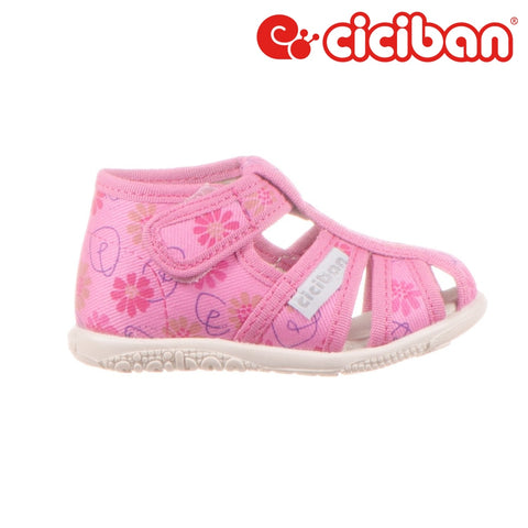 Girl's‚ open slipper or light shoe, handmade in Europe. Pink‚ with colourful flower print.