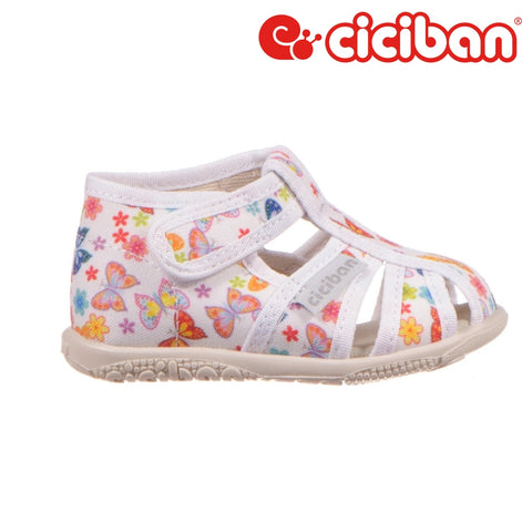 Girl's‚ open slipper, handmade in Europe.‚ White with colourful butterfly print.